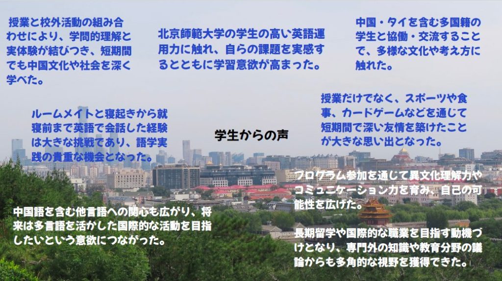 さらに、北京師範大学のコーディネーターや学生スタッフは移動・施設案内・週末のエクスカーションまで丁寧に対応してくださり、学生たちは安心して滞在することができました。宿舎も大学近くにあり、清潔で利便性が高く、快適に過ごせる環境が整っており、参加学生にとって大変充実したプログラムとなりました。